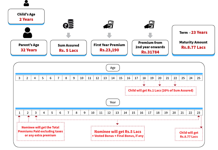 • On Maturity, child gets the guaranteed 40% of Sum Assured along with Yearly Bonus & Final bonus