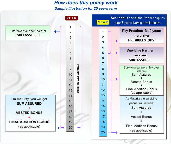 • Surviving spouse gets Life Cover: Sum Assured + Bonus + Final Addition Bonus (as applicable)