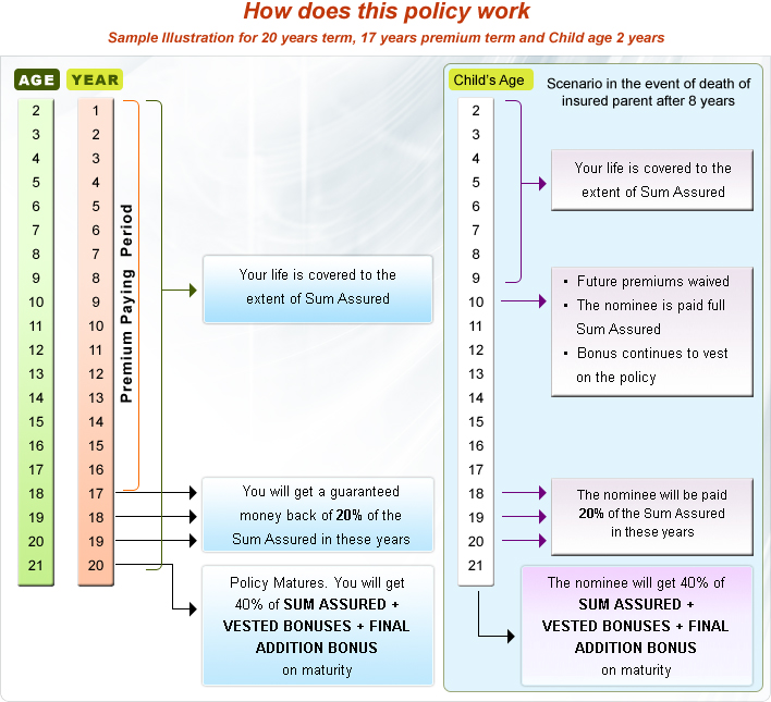 • The plan can be taken by a parent on his or her own life. Benefits under the plan are payable at pre-specified dates irrespective of whether the Life Assured survives to the end of the policy term or dies during the term of the policy