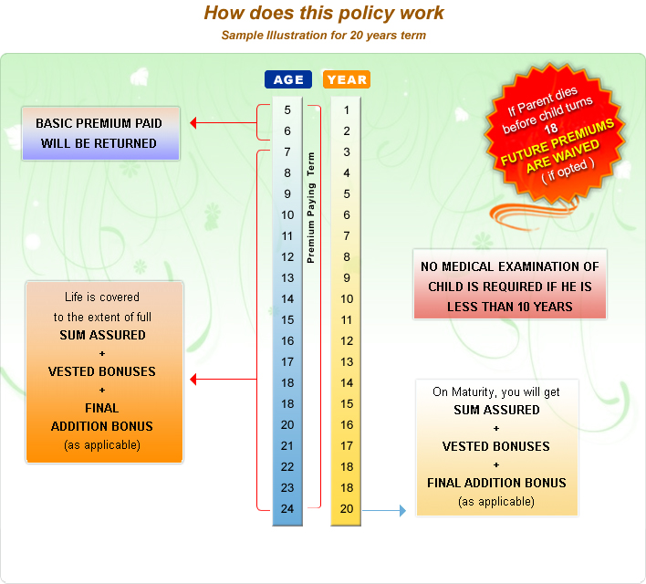 • Life Cover: Full Sum Assured + Bonus + Final Addition Bonus (as applicable). Life cover starts at age 7 or 2 years from date of commenecement whichever is later