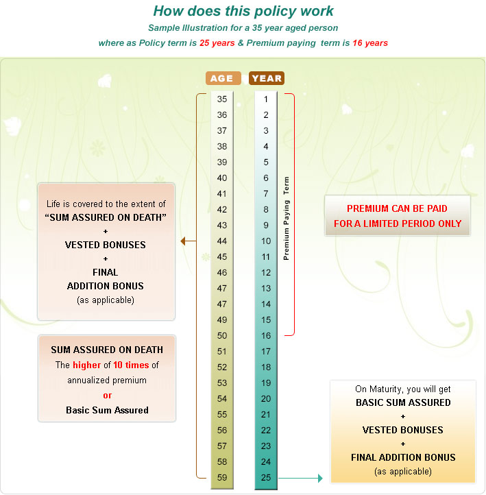 of this plan is, the payment of premiums is limited to a term shorter than the policy (Limited Premium Payment -LPP). The maturity amount is payable at the end of the policy term, or on the death of the policy holder whichever is earlier.